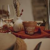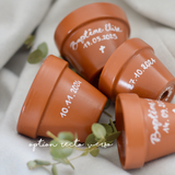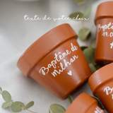 Apportez une touche unique et artisanale à votre événement avec le mini pot de fleur personnalisé. Idéal comme cadeau invité baptême, il peut accueillir de petites plantes (succulentes, cactus), mais aussi un mini sachet de dragées ou de graines. Polyvalent, raffiné et durable, ce petit pot en terre cuite peint à la main laissera un souvenir précieux de cette journée spéciale.